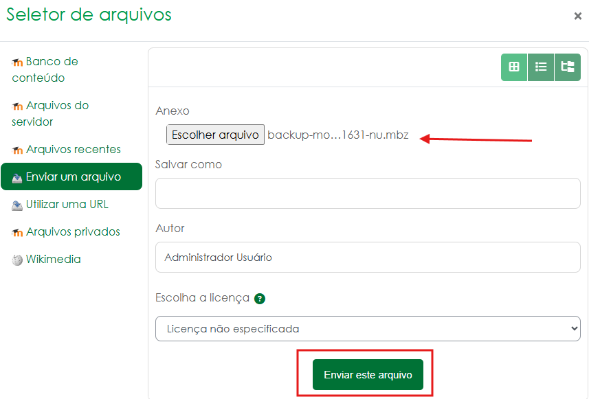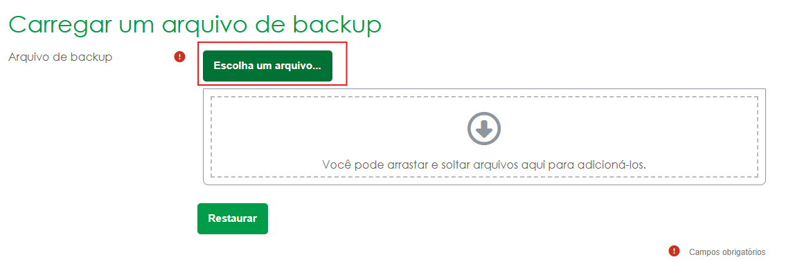 4) Clique na opção Escolha um arquico, para a realização do upload do arquivo de backup, criado no tutorial anterior.