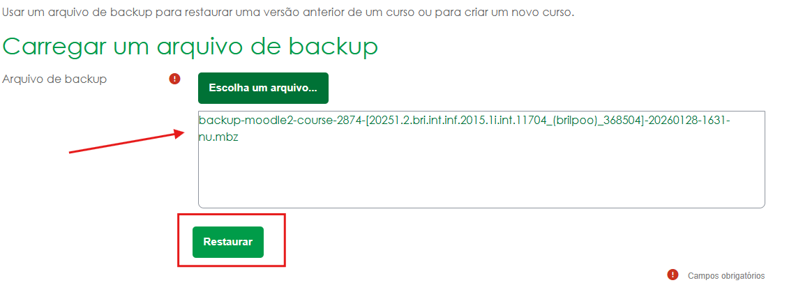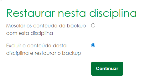 Excluir o conteúdo desta disciplina e restaurar o backup: CASO TENHA ALGUM CONTEÚDO NA DISCIPLINA, ESCOLHENDO ESSA OPÇÃO TODO O CONTEÚDO EXISTENTE SERÁ EXCLUIDO E SUBSTITUÍDO PELO CONTEÚDO DO ARQUIVO DE BACKUP.